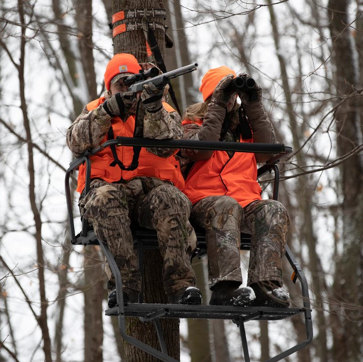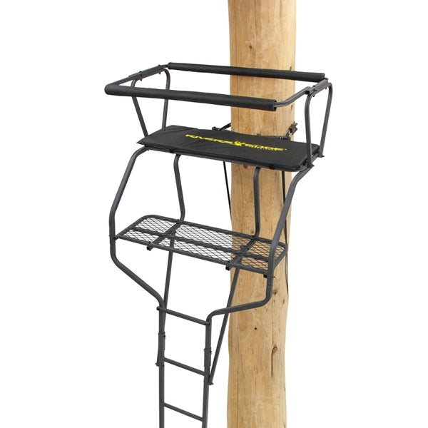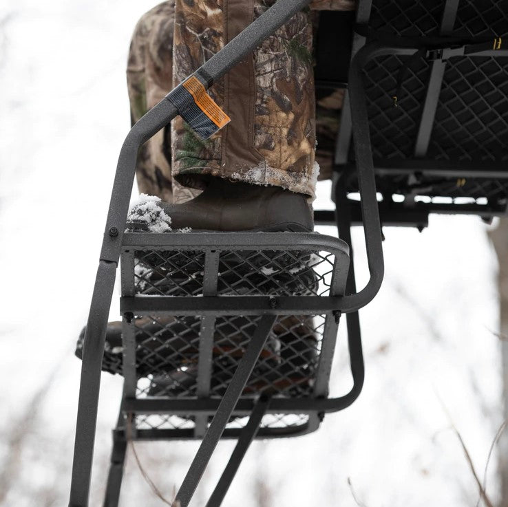 A TALL 2-MAN LADDER STAND – If you are looking for a tall 2-man ladder stand that is affordable and reliable, the 18’ 2-Man ladder stand is the one for you. The padded bench seat is roomy enough for two hunters or great for a solo hunter who likes extra elbow room. The flip-back, padded shooting rail makes for an easy entry or exit.