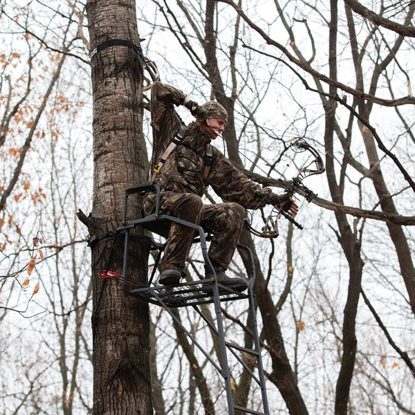 The Bowman ladder stand was designed for the archer. The Bowman is tall so you can avoid detection at close ranges and sit tight to the tree to conceal your silhouette. Featuring a flip-up, TearTuff™ mesh seat paired with a 26″ deep platform, this stand provides plenty of extra room for standing shots. If you’re a bowhunter, look no further, the Bowman ladder stand is as dedicated to bowhunting as you are.